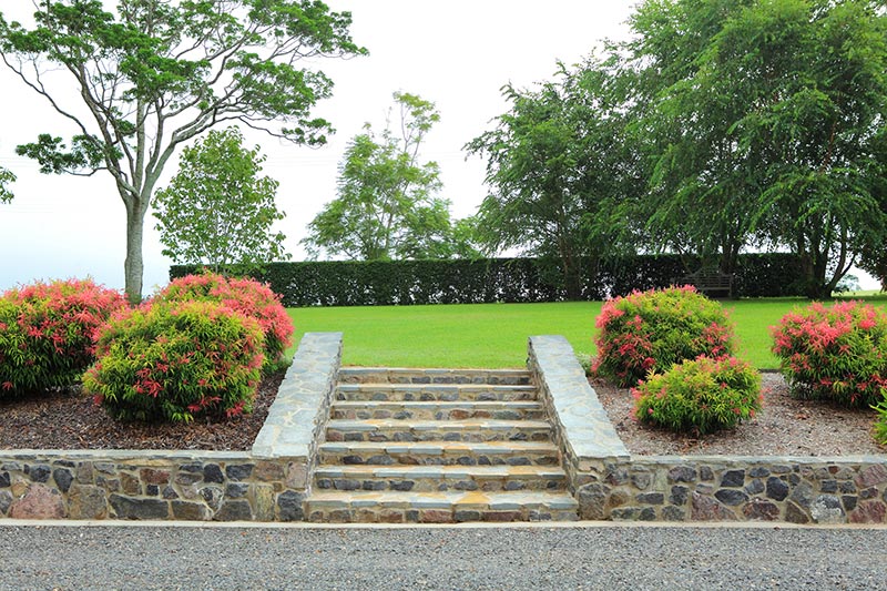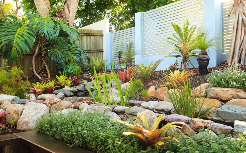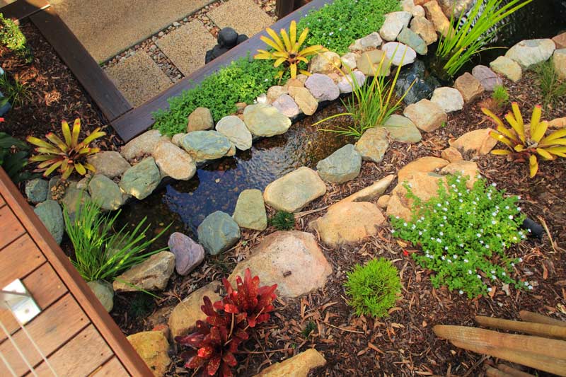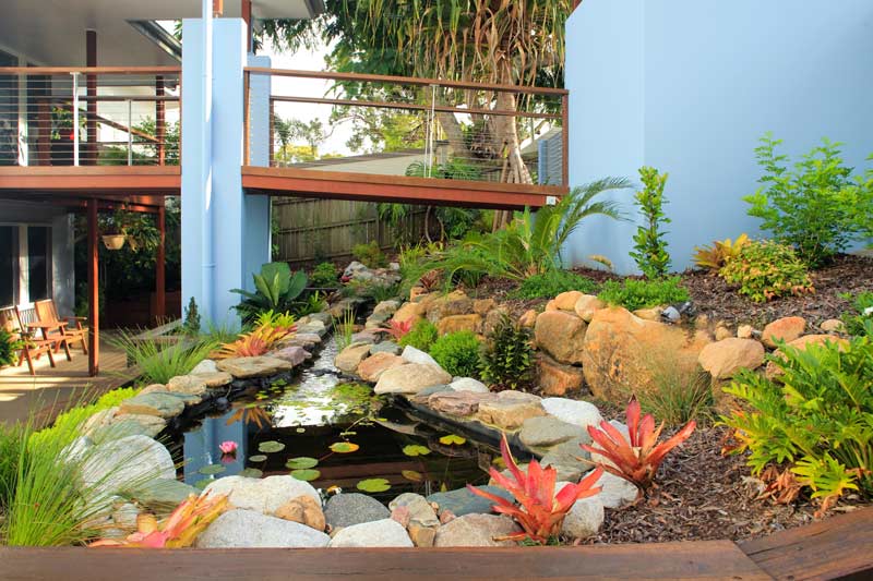 Existing boulders that were cost prohibitive to move were incorporated into the overall design, while the pond filtration system had to be able to deal with leaf litter from a neighbouring Poinciana tree. We were also mindful that the water feature would be viewed from above as well as below. Plants used were a combination of existing specimens, client requests and our recommendations.